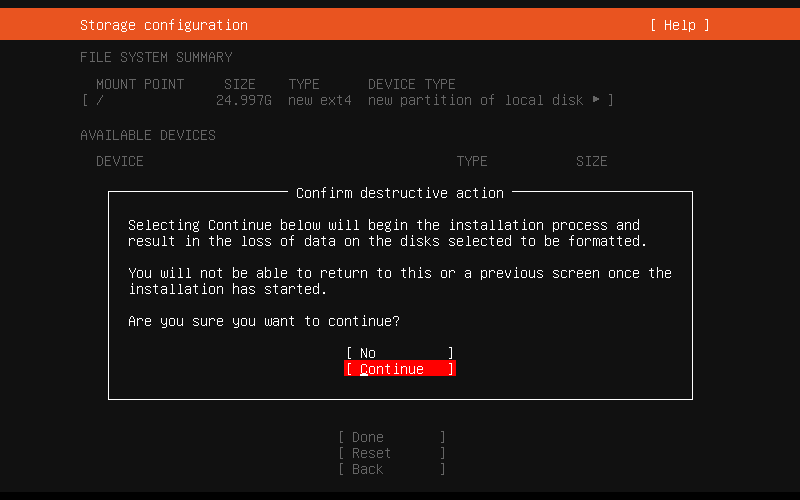 Подтвердите очистку всех данных на выбранном диске и запуск процедуры установки операционной системы. Выберите Continue. Нажмите Enter.