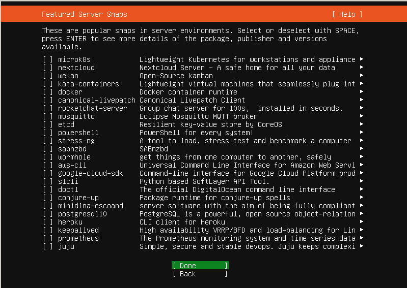 Параметр Комментарий Your name Полное имя пользователя Your server's name Имя сервера Pick a username Логин пользователя для входа в систему Choose a password Пароль учётной записи пользователя Confirm your password Пароль учётной записи пользователя для подтверждения правильности ввода. - В следующем окне задайте установку пакета OpenSSH server. Для этого с помощью клавиши Space (Пробел) выберите Install OpenSSH server. Выберите Done. Нажмите на клавишу Enter.