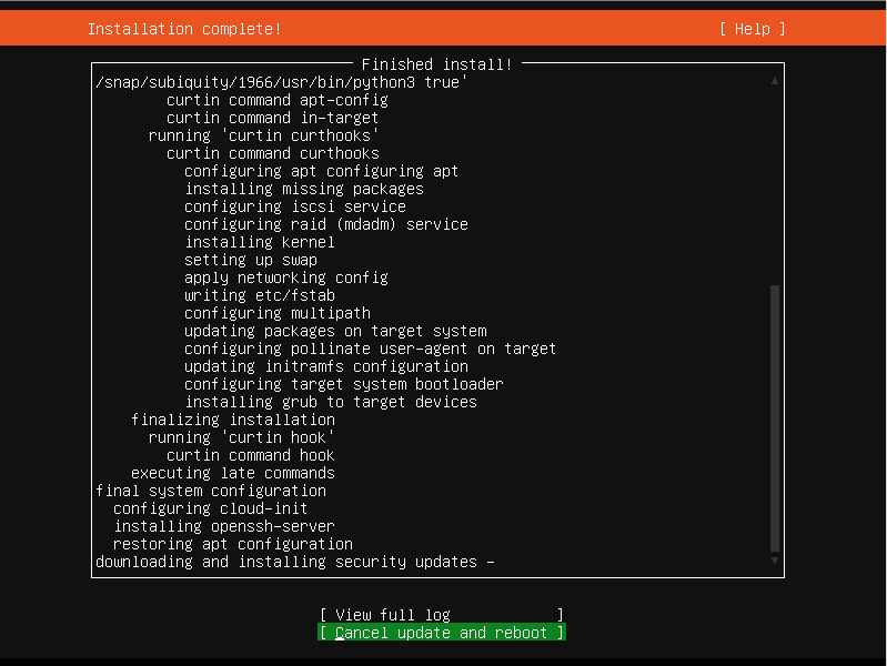 - Затем выберите Cancel update and reboot. Нажмите на клавишу Enter. Будет выполнена перезагрузка сервера.