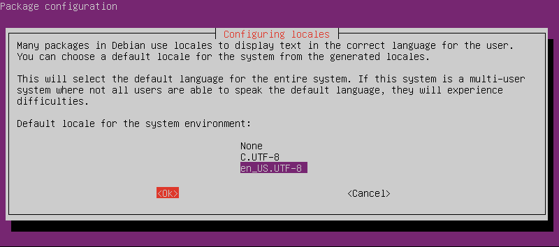 - В следующем окне установите en_US.UFT-8 в качестве используемой по умолчанию. Затем с помощью клавиши TAB клавиатуры перейдите на ОК и нажмите на клавишу Ввод (Enter).