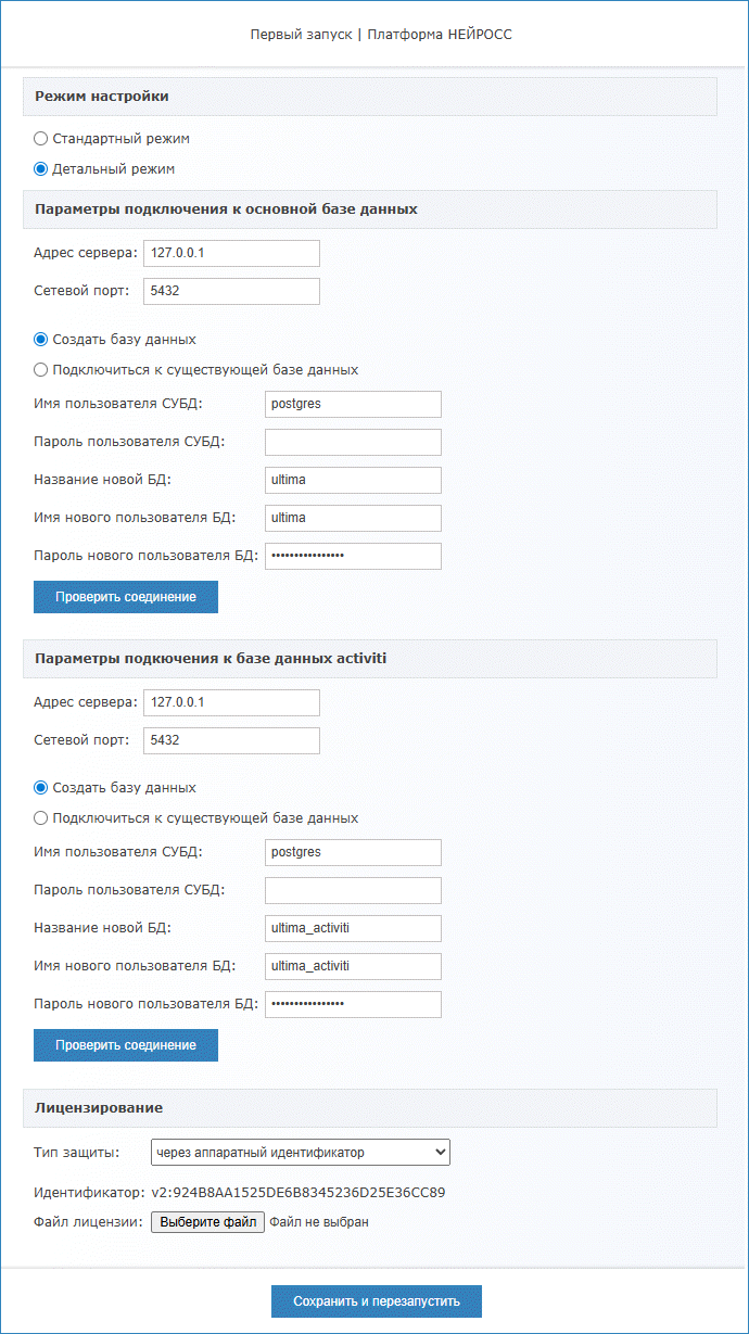 В процессе первого запуска будут автоматически созданы все требуемые базы данных со стандартными параметрами подключения к серверу СУБД, пароли пользователей основной базы данных ultima и базы данных ultima_activiti будут сгенерированы и записаны в файле конфигурации.