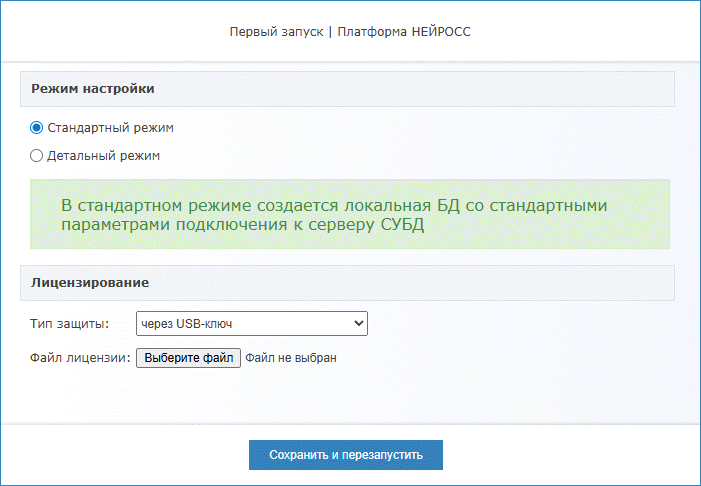 С версии 20.36 Платформы НЕЙРОСС переработан интерфейс окна первого запуска: добавлен выбор режима настройки. В стандартном режиме все настройки заданы по умолчанию. Этот режим используется при установке Платформы НЕЙРОСС в стандартной конфигурации согласно инструкции по установке. Детальный режим позволяет задать нестандартную конфигурацию.