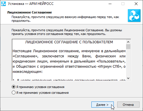 Прочитайте условия лицензионного соглашения и в случае согласия подтвердите их принятие. Нажмите Далее.