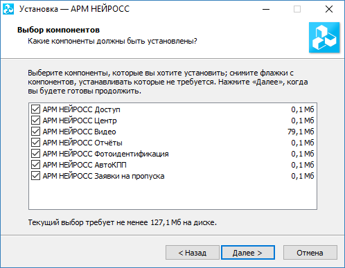 Проверьте список компонентов АРМ НЕЙРОСС. Если установка каких-то компонентов не требуется, снимите соответствующие флажки. Нажмите Далее.