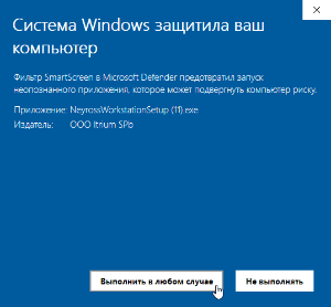 При получении сообщения «Система Windows защитила ваш компьютер» нажмите Подробнее, затем Выполнить в любом случае. При получении сообщения контроля учётных записей разрешите приложению АРМ НЕЙРОСС вносить изменения на текущем компьютере (нажмите Да).