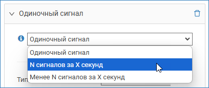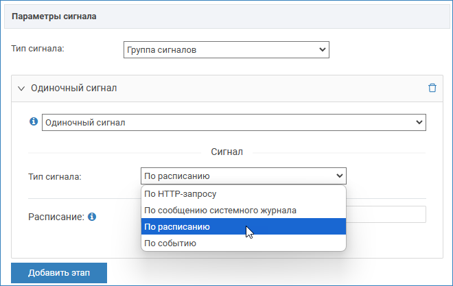 - Если выбран Одиночный сигнал, выберите из раскрывающего списка тип сигнала и укажите параметры сигнала. Одиночный сигнал — эквивалент любого негруппового условия выполнения задания: по расписанию, по HTTP-запросу, по событию, по системному действию. Такой сигнал может использоваться в качестве точки старта подсчета количества повторяющихся сигналов на следующем этапе.