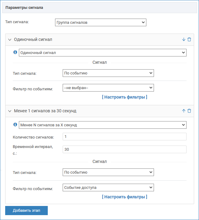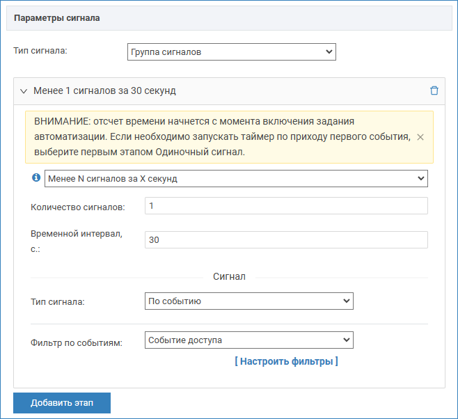 - Если выбрано Менее N сигналов за X секунд, также требуется указать количество сигналов и количество секунд, в течение которых ведётся подсчёт сигналов, а также тип сигнала и параметры сигнала. Если за указанное количество секунд получено равное или большее количество сигналов, этап завершается неуспешно, задание не выполняется. Если за указанного время получено меньшее количество сигналов, этап считается пройденным, происходит переход к следующему этапу (при наличии), либо выполнение действия, заданного в задании.