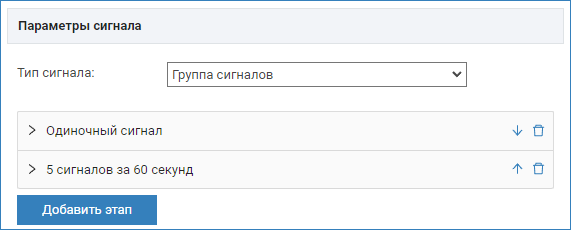 - Если выбрано N сигналов за X секунд, требуется указать количество сигналов и количество секунд, в течение которых ведётся подсчёт сигналов, а также тип сигнала и параметры сигнала. Если за указанное количество секунд получено меньшее количество сигналов, этап завершается неуспешно, задание не выполняется. Если в течение срока действия этапа получено требуемое количество сигналов, этап считается пройденным и завершается до истечения срока (заданного в поле Продолжительность), происходит переход к следующему этапу (при наличии), либо выполнение действия, заданного в задании.