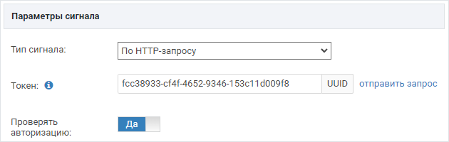 В блоке Параметры сигнала в поле Тип сигнала выберите из раскрывающегося списка По HTTP-запросу. Будет сформирован уникальный токен запроса, вы можете изменить его на токен, генерируемый «внешней» системой.