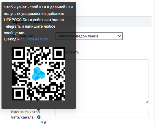 QR-код со ссылкой доступен с версии 20.8 Платформы НЕЙРОСС. При работе на более ранних версиях Платформы НЕЙРОСС вы можете воспользоваться ботом @userinfobot, чтобы выяснить идентификатор своего канала.