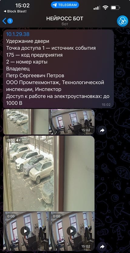 Пример Telegram-уведомления с кадрами и видеофрагментами по тревоге точки доступа по шаблону