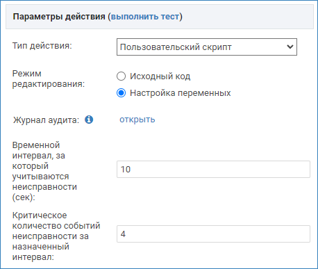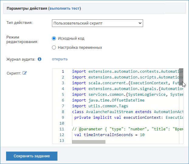 При выборе в качестве параметра действия «Произвольный скрипт», вам потребуется ввести код скрипта и сохранить задание. Для удобства создания собственных скриптов предоставляется базовый шаблон скрипта.