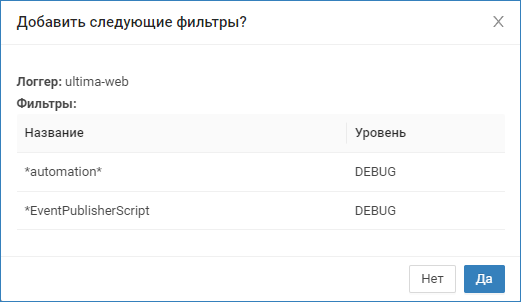 При переходе в журнал аудита отображается приглашение добавить фильтры для логирования ошибок компиляции. Нажмите на кнопку Да.