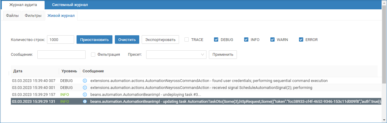 Платформа НЕЙРОСС обеспечивает логирование процедуры выполнения скрипта и ошибок компиляции [Журнал аудита]. Для отладки скрипта перейдите в «живой» журнал аудита (нажмите открыть в поле Журнал аудита).