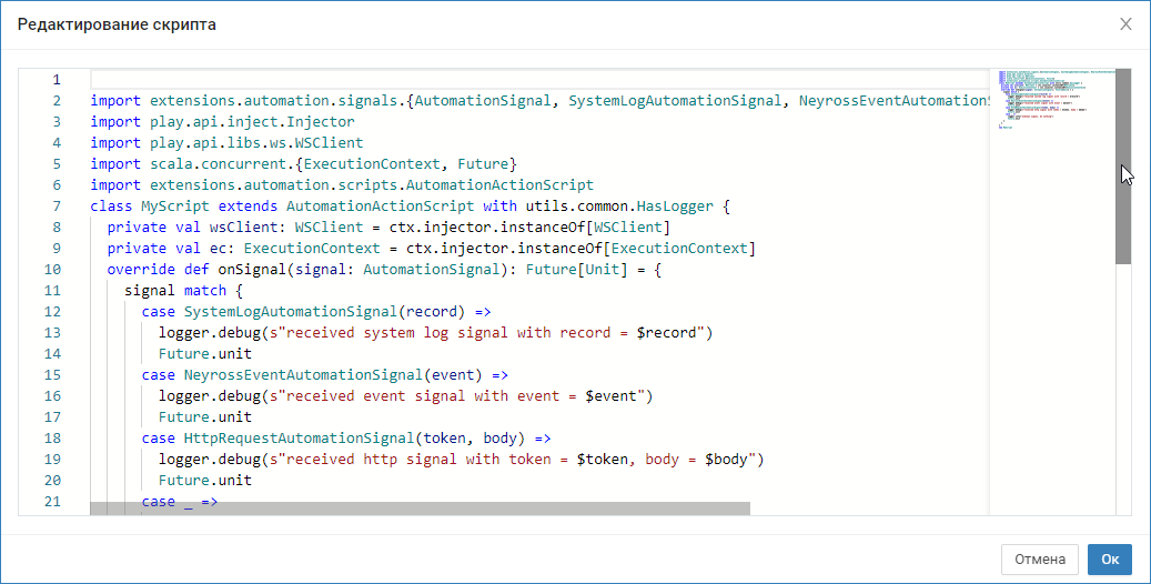 Функция выполнения произвольного скрипта позволяет использовать сложные алгоритмы анализа входных условий и последовательности выполняемых действий. Предоставляется механизм Scala-скриптовой логики и современный редактор с удобной навигацией и подсветкой синтаксиса. Это позволяет решать нестандартные объектовые задачи, «не покрытые» базовым функционалом Платформы НЕЙРОСС, в том числе самостоятельно, с помощью сервиса services.common.CodeCompilationService.