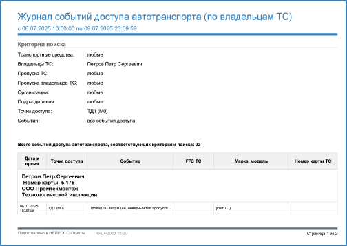7. Отчет Журнал событий доступа автотранспорта (по владельцам ТС)