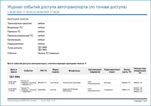 7. Отчет Журнал событий доступа автотранспорта (по точкам доступа)