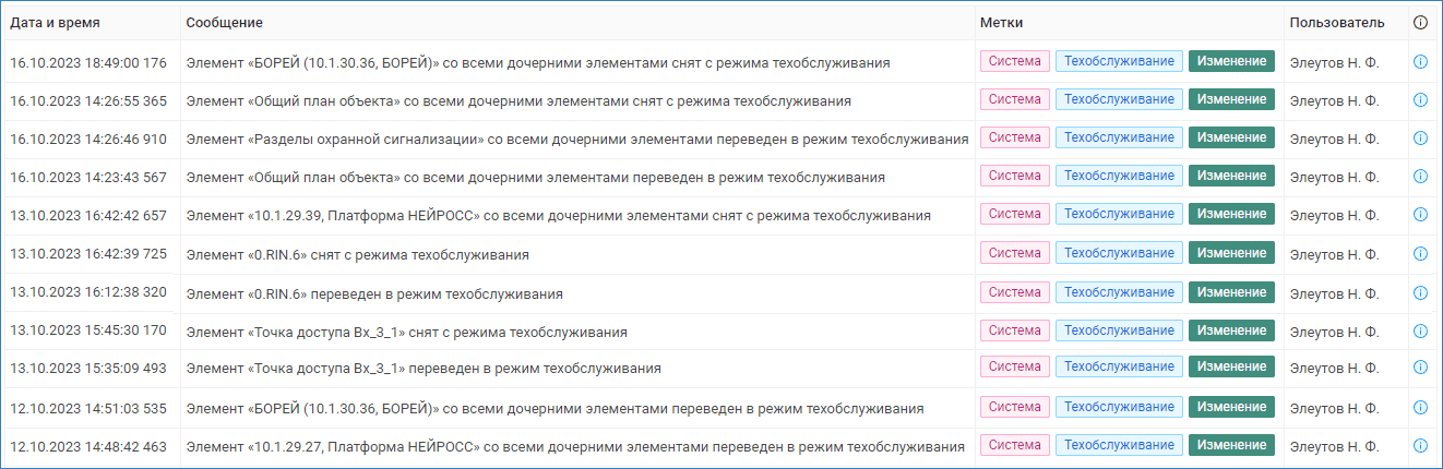 В процессе обслуживания и ремонта оборудования необходимо обеспечить выключение этого оборудования из сферы мониторинга во избежание возникновения ложных тревог и, соответственно, — временных и финансовых потерь. Для решения этой задачи с версии 20.9 Платформы НЕЙРОСС реализован механизм перевода в режим техобслуживания и снятие с него элементов системы безопасности НЕЙРОСС. Режим техобслуживания предназначен для игнорирования состояния потери связи, тревог и неисправностей от оборудования, находящегося на техобслуживании (ремонт, тестовая эксплуатация и проч.). События от элементов, находящихся на техобслуживании, не поступают в ленту событий АРМ НЕЙРОСС Центр, запуск сценария обработки по ним не производится. Также события от элементов, находящихся на техобслуживании, игнорируются в фильтрах событий и не приводят к запуску заданий автоматизации. В режим техобслуживания может быть переведён как отдельный элемент (зона сигнализации, точка доступа, камера), так и весь узел, например, — Платформа НЕЙРОСС или контроллер БОРЕЙ. При этом в режим техобслуживания автоматически переводятся и все дочерние элементы узла. Также возможен перевод в режим техобслуживания группы однородных элементов — разделов сигнализации, планов и любых других элементов НЕЙРОСС. При переводе родительского элемента, автоматически переводятся и все дочерние элементы. Справедливо и обратное — при снятии узла или какого-либо родительского элемента с режима техобслуживания, автоматически снимаются и все дочерние элементы. События постановки на техобслуживание и снятие с него фиксируется в системном журнале Платформы НЕЙРОСС [Системный журнал]. При этом в дополнительной информации о событии перечисляются все затронутые дочерние элементы. Все события от элементов, находящихся в режиме техобслуживания, фиксируются в Журнале событий Платформы НЕЙРОСС [Журнал событий] однако для однозначности в поле Источник соответствующие элементы помечаются значком . В АРМ НЕЙРОСС Центр Общие сведения